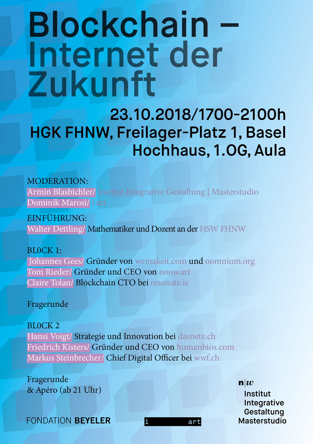 Organisiert durch das Institut Integrative Gestaltung | Masterstudio, der Fondation Beyeler und iart gibt die Veranstaltung Einblick in die Funktionsweise, die Möglichkeiten und die gesellschaftlichen Implikationen einer Technologie, die dazu ausholt, die Art und Weise wie Menschen zusammenarbeiten, grundlegend zu verändern.