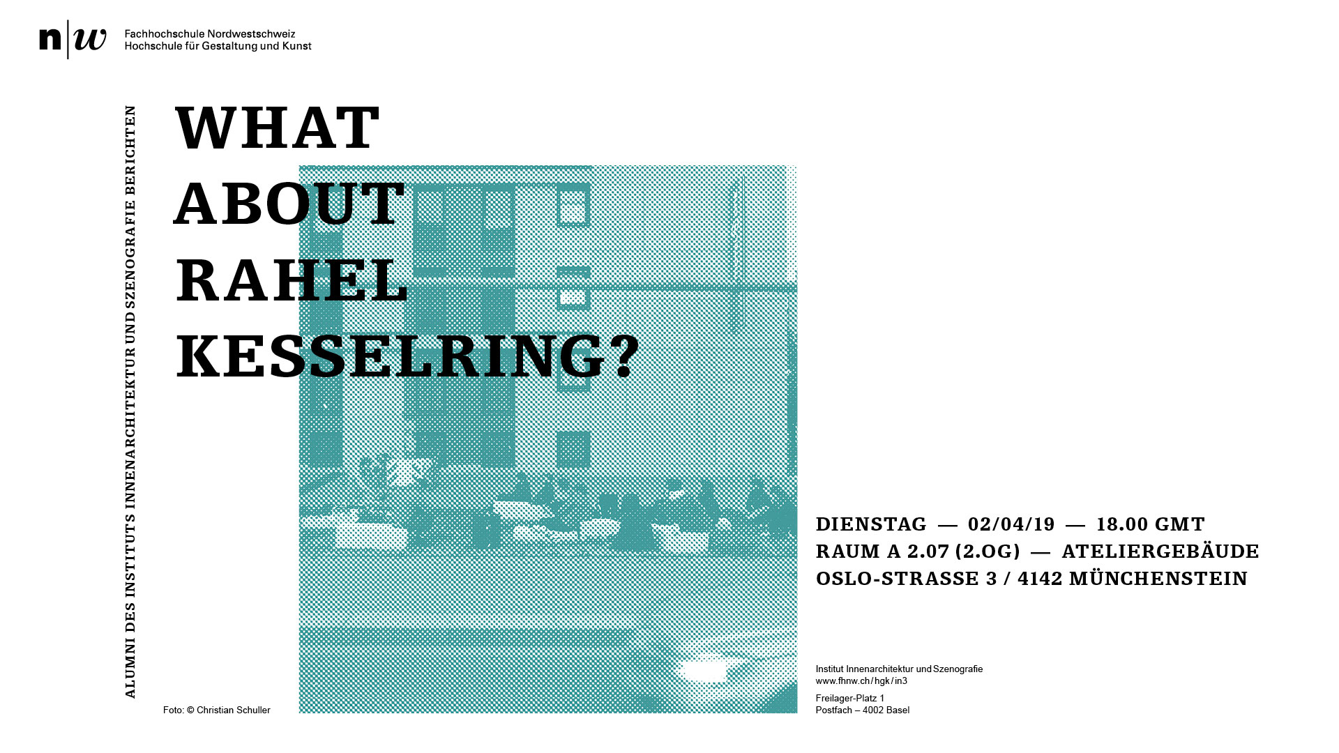 Seit 2012 arbeitet Rahel Kesselring (Diplom 2010) als Bühnenbildnerin und entwickelt Szenografien, Raum- und Lichtkonzepte — im Zentrum ihres Interessens stehen prozessuale Räume und ephemere Materialien, als praktische, wie auch als theoretische Auseinandersetzung. Sie arbeitet in unterschiedlichen Gruppierungen im Bereich Performance, Musiktheater und Installation, unter anderem mit Daniel Kötter und Hannes Seidl (u.a. steirischer herbst 2013, Frankfurter Positionen 2015/16, Maerzmusik Berlin 2015/16, Wien Modern 2016), mit Caroline Creutzburg (u.a. Körber Stiftung für junge Regie 2017, Veem House Amsterdam, Beursschouwburg Brüssel und Spielart Festival München 2017), mit Jacob Bussmann (Studio Naxos Frankfurt, Implantieren Festival Frankfurt 2018) und mit Miriam C. Schulte (far Festival Nyon 2018 und Kaserne Basel 2019).