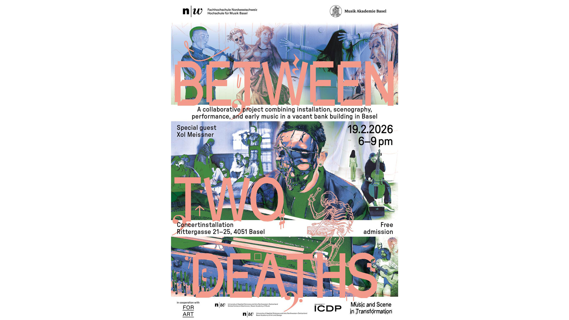Am 19. Februar 2026 wird ein ehemaliges Bankgebäude in Basel zum Spielort der interdisziplinären Konzertperformance «Zwischen zwei Toden» mit rund 30 Master-Studierenden der Hochschule für Musik Basel und der HGK Basel.