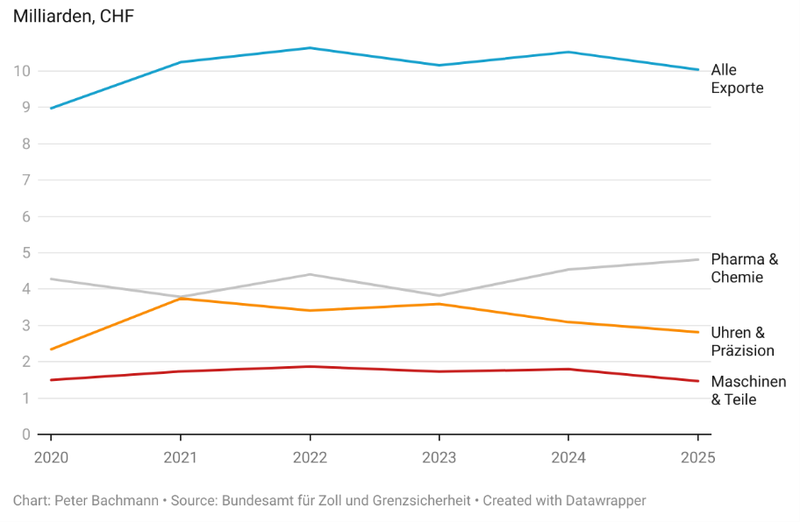 Einzig die Bereiche Pharma und Chemie konnten ihre Exporte in die Volksrepublik China erhöhen. Andere Sektoren, wie die Uhren und Maschinen Industrien, sind weniger erfolgreich unterwegs.