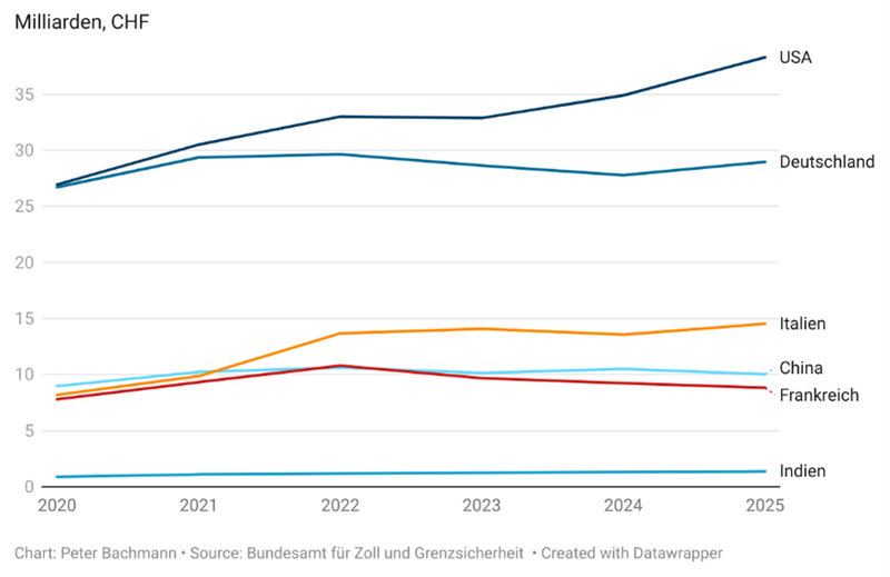 Exporte in die USA nahmen in der gleichen Zeitperiode um 29 Milliarden Franken zu und Ausfuhren in die Nachbarstaaten Deutschland, Frankreich und Italien um 14 Milliarden Franken. Auch in den letzten fünf Jahren haben die Exporte in die Volksrepublik nicht besser abgeschnitten, obwohl das Wachstum in China im Vergleich zu anderen Nationen sehr hoch war. Es erstaunt daher nicht, dass Italien seit 2021 der drittwichtigste Absatzmarkt für Schweizer Firmen ist, und nicht mehr China.