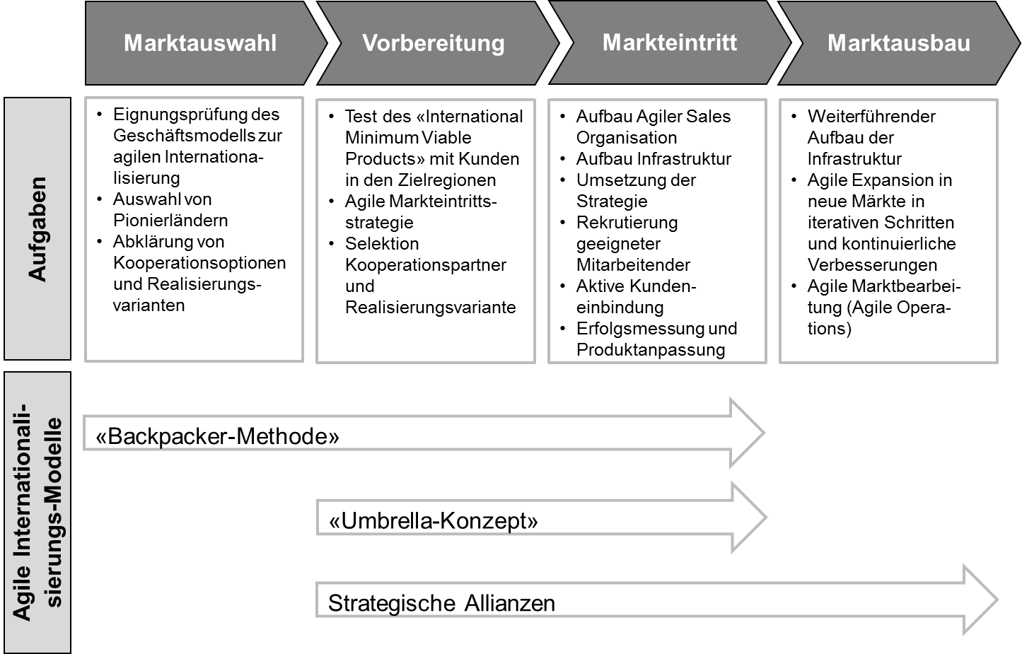 Dabei machen wir uns die Prinzipien von Agile Development zunutze, das aus der Softwareentwicklung heraus entstanden ist. Diese können auf Internationalisierungsstrategien von KMUs und Startups in einem 4-Phasen-Prozess angewendet werden: