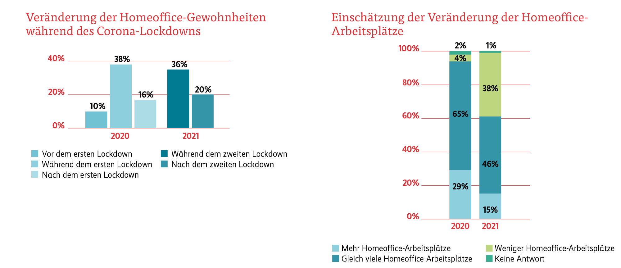 Vor dem ersten Lockdown im März 2020 arbeiteten in denjenigen KMU, in welchen für mindestens eine Mitarbeiterin/einen Mitarbeiter das Homeoffice möglich wäre, 10% von zu Hause. Dieser Wert hat sich während dem ersten Lockdown fast vervierfacht (auf 38%) und sank danach auf 16% (eine Steigerung von 60% gegenüber der Situation vor dem Lockdown). Dieser Wert hat sich während dem zweiten Lockdown wiederum fast verdreifacht (von 16% nach dem Lockdown auf 36% während der Homeoffice-Pflicht) und hat sich nun über alle Industrien hinweg auf einem höheren Niveau (bei 20%) eingependelt. Der Vergleich der zwei Wellen zeigt, dass sich die Nutzung des Homeoffice als Arbeitsort in Schweizer KMU seit Beginn der Coronakrise verdoppelt hat.