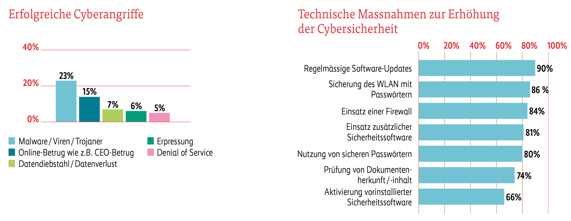 Mit Corona/COVID-19 und der Zunahme von Mitarbeitenden im Homeoffice nahmen auch die Angriffe im Cyberraum zu. Geschäftsleitende von Schweizer KMU sagen deshalb, dass die Cyberkriminalität ein ernstzunehmendes Problem ist (bewertet mit 4,6 auf der 5er-Skala) und dass Massnahmen gegen Cyberattacken wichtig sind (4,4).