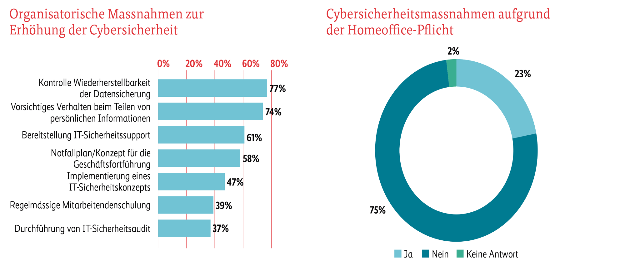 Analog der Umfrage in 2020 sind die Schweizer KMU relativ weit fortgeschritten mit der Umsetzung technischer Massnahmen zur Erhöhung der Cybersicherheit. Viel Potenzial zeigt sich jedoch bei der Planung und Umsetzung organisatorischer IT-Sicherheitsmassnahmen: Nur knapp die Hälfte der Schweizer KMU verfügt über ein IT-Sicherheitskonzept und nur zwei Fünftel schulen ihre Mitarbeitenden regelmässig oder führen IT-Sicherheitsaudits durch. Während der Homeoffice-Pflicht investierten deshalb ein Viertel der KMU in zusätzliche Massnahmen wie Sicherheitssoftware, Firewalls und stärkere Passwörter. Die Ergebnisse der Studie zeigen auch, dass KMU in vielen Fällen die Datenschutzverantwortlichkeit regelten (bei zwei Dritteln der KMU) und Prozesse zum Datenmanagement definierten.
