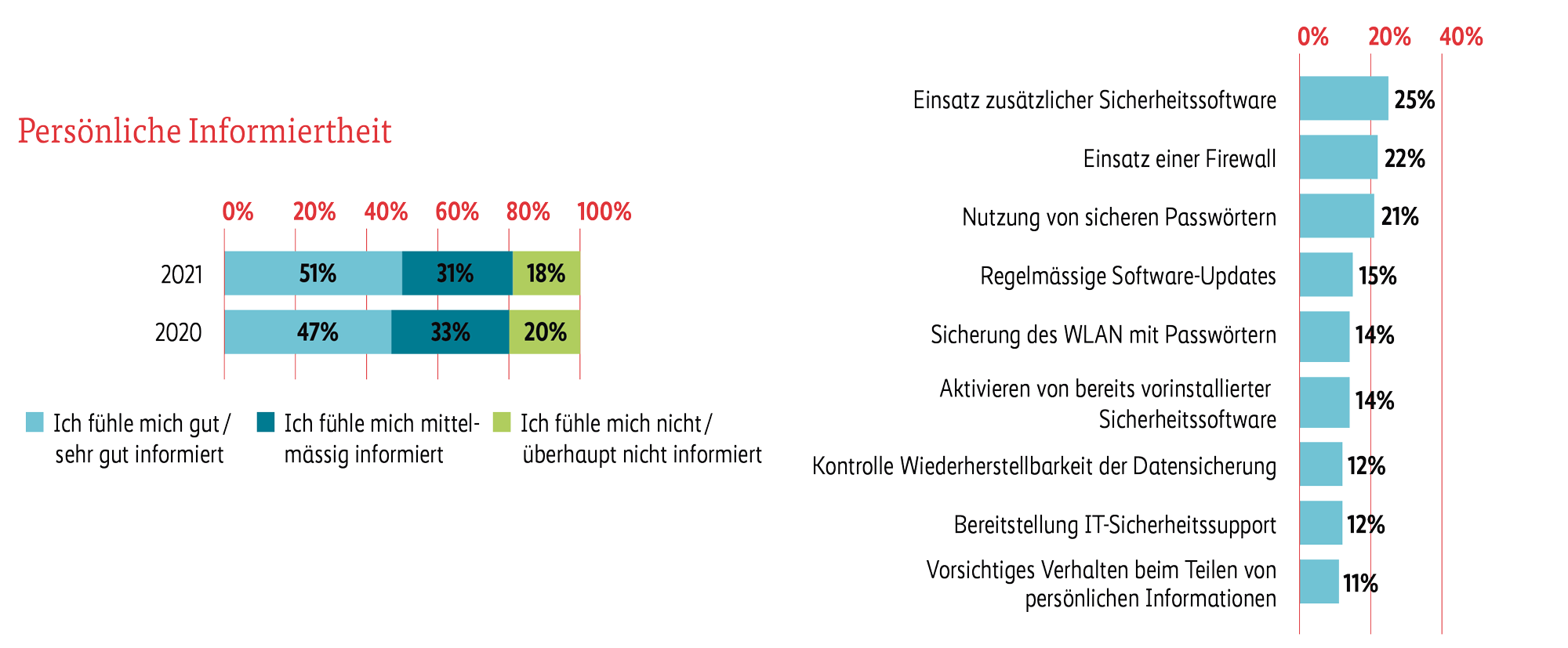 KMU-Geschäftsleitende, die zum Thema Cybersicherheit informiert sind, haben in der Regel mehr Massnahmen zum Schutz ihrer IT-Infrastruktur und Kundendaten implementiert als nicht informierte. Die Themen der Digitalisierung, des Homeoffice, des Einsatzes von Kommunikationstechnologien und der Cybersicherheit im Umfeld von Corona/COVID-19 haben weiter an Wichtigkeit gewonnen. Gleichzeitig werden diese Themen gesellschaftliche, wirtschaftliche, technologische und verkehrstechnische Diskussionen vorantreiben.