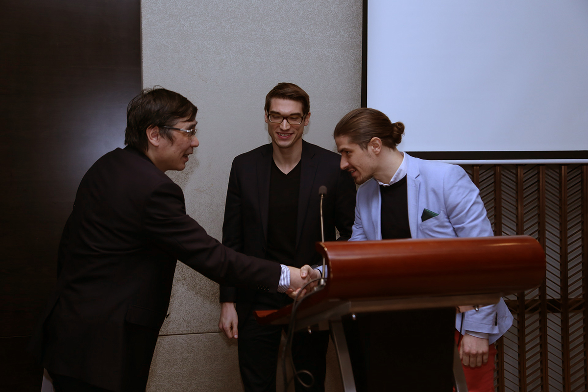 Dominik Trost (rechts) und Sven Brunner (mitte) stellen sich beim SinoSwiss Technopark in Chongqing vor.