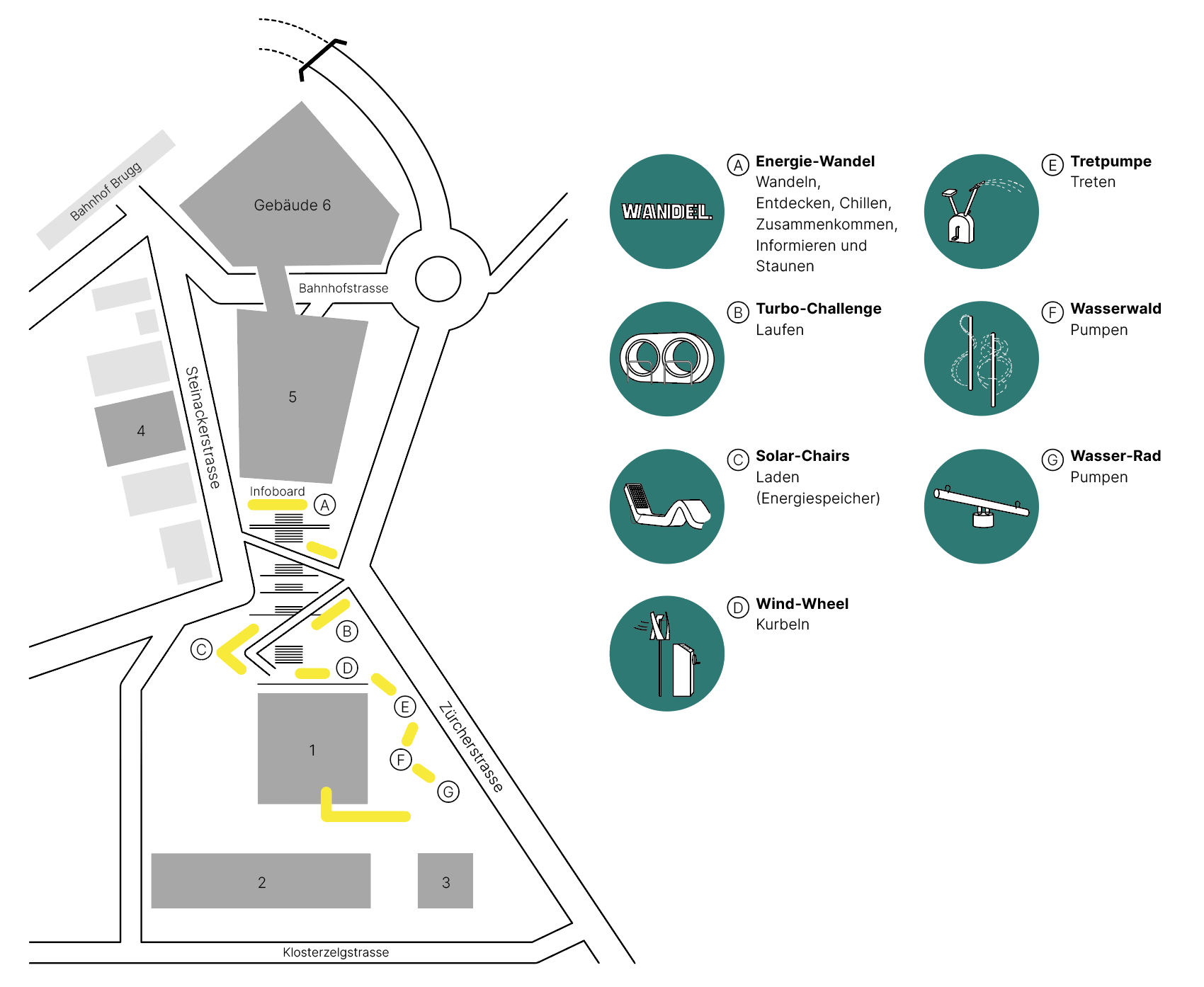 Die Route des Energiepfads soll vom Gebäude 5 in unmittelbarer Nähe des Bahnhofs über den Fahrradweg bis zum Lichthof des Gebäudes 1 führen. Der Weg ist so angelegt, dass insbesondere Schulklassen, die den «Legionärspfad Vindonissa» in Windisch besuchen, auf den Energiepfad aufmerksam werden.
