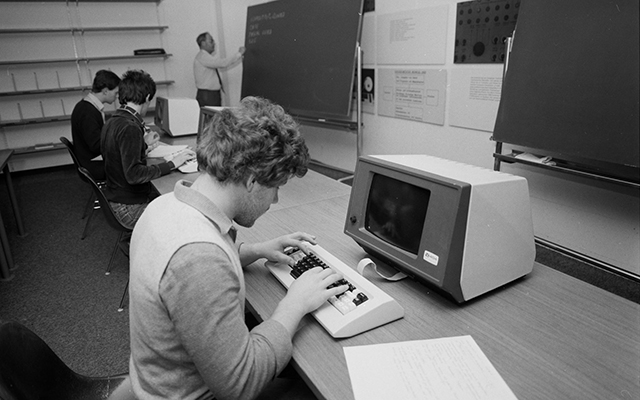 Studenten bedienen die Prime-400-Rechenanlage mit dem VC-414-Terminal. Im Hintergrund Dozent Ulrich Stricker, der massgeblich für den neuen Studiengang verantwortlich war. Quelle: ETH-Bibliothek Zürich, Bildarchiv / Fotograf: Vogt, Jules / Com_M30-0281–0001–0004 / CC BY-SA 4.0