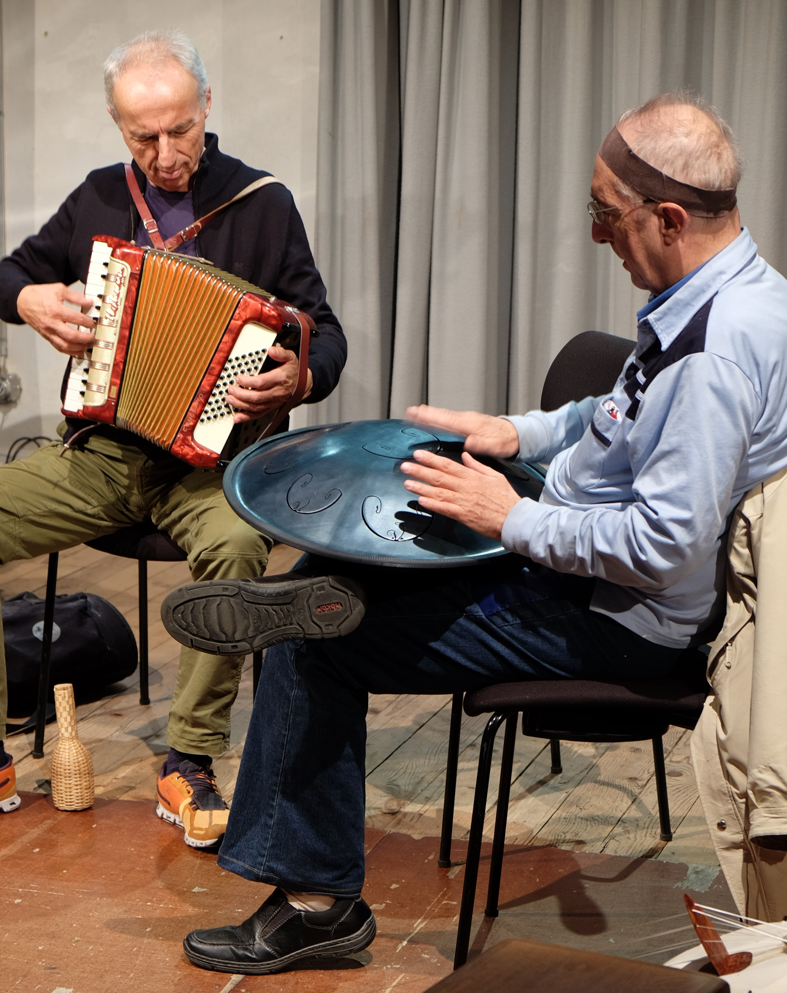 „Das nennt man wohl Flow“ – so endet der Bericht zur zweiten „All In Jam“ vom vergangenen Mai. In dieses Fliessen sind auch bei der dritten Ausgabe am 13.11. – wie gewohnt in der Druckereihalle des Ackermannshofes in Basel – Menschen aus unterschiedlichen Lebenskontexten eingestiegen. Als „Fährmann“ durften wir wieder Andreas Gerber, Musiker, Rhythmus- und Improvisationslehrer, der auch diesmal einen Teil seines faszinierenden Instrumentariums aus dem „Atelier für Körpermusik“ in Liestal im Gepäck hatte, begrüssen. „Was werden wir hier machen? Freie Impro?“, fragt eine Teilnehmerin vor der Veranstaltung mit vorsichtiger Neugier. „Was ist frei?“, spielt Andreas Gerber den Ball sofort zurück und gibt sich selbst, laut nachdenkend eine Art Antwort: „Ja… man kann hier frei geben“. Die musikalischen (Hin-)Gaben stammen diesmal von einer kleinen, feinen Runde. Kann man in der Erinnerung an Mai von einem „Orchester“ sprechen, so handelt es sich analog dazu bei der dritten Jam Session um ein „Kammermusik-Ensemble“ (A. G.). „Man hört vier vernünftige Leute sich unterhalten (...)“, meinte Goethe einmal über das Streichquartett – und mit der „Vernunft“ rekurriert er auf das gleichberechtigte zu Wort Kommen, auf die Individualität und Relevanz jedes Einzelnen und die Homogenität im gemeinsamen Tun. Ob der klanglichen Transparenz werden die sechs musikalischen Gesprächspartner des Abends – auf unterschiedlichen Instrumenten wie dem Kornett und der afrikanischen Ngoni, dem Cajon und der Melodika, dem Akkordeon und der Stimme, dem Klavier oder der chinesischen Erhu – besonders gut hörbar. Der Auftrag, bei der Improvisation darauf zu achten, das eigene Musizieren mit dem Innen und dem Aussen zu verbinden, ist kein Kinderspiel. Gleiches gilt für die Haltung einer Nicht-Existenz von (musikalischen) Fehlern – ergo das eigene Abweichen nicht zu werten, sondern kreativ in den Prozess einzubeziehen. Und jedes Mal ist es wieder ein Wunder, wie es gelingt, dass Menschen, die sich nicht kennen und mit vollkommen unterschiedlichen Voraussetzungen zusammenkommen, gemeinsam klanglich, rhythmisch Fäden spinnen, schöpferisch Neuland erkunden, im Moment etwas riskieren und ein musikalisches „Album“ (Zitat eines Teilnehmers) entstehen lassen. Dem achtsamen (Beg-)Leiter des Abends sei dafür Dank gesagt.