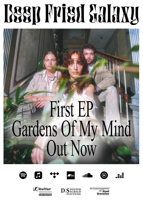 Deep Fried Galaxy machen druffnigen Indie-Sound im 21. Jahrhundert. Bei Dinos galaktischen Synthieklängen, Johnnys frittierten Basslines und Lisas deepen Texten schlagen offene Herzen höher und Momente werden tiefer. 2022 hat das Trio seine Debut EP Gardens Of My Mind veröffentlicht und spielt sich seither quer durch die Deutschschweiz und in die digitalen und physischen Musiksammlungen von Indietronica- und Dreampop-Liebhaber*innen.