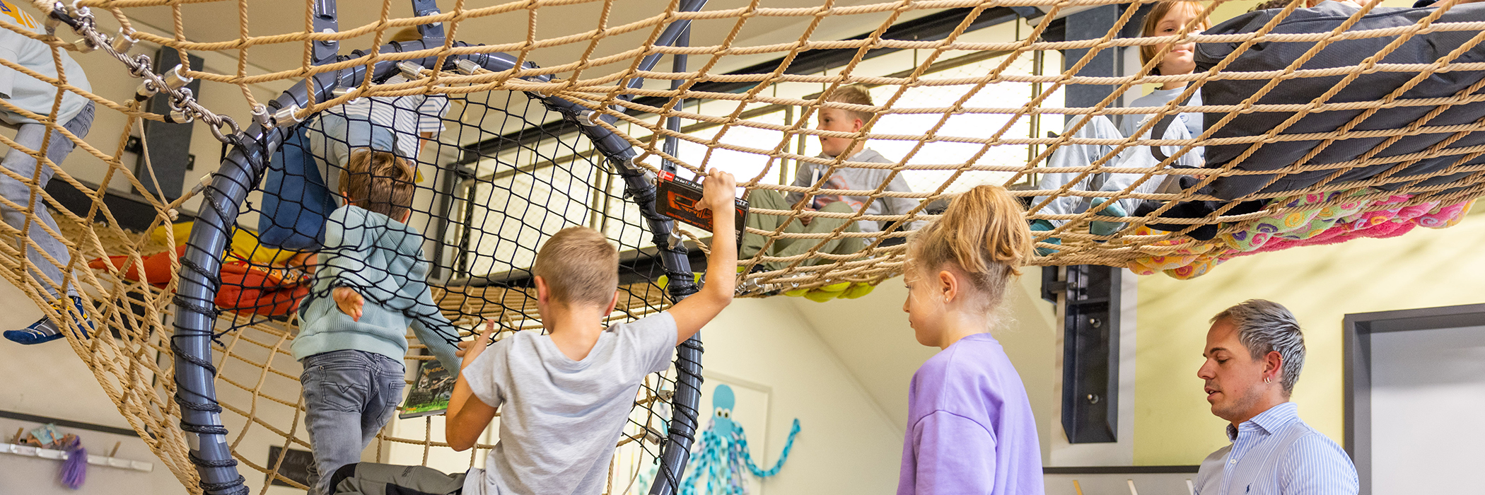 «Netzwelten» erweitern den Lernraum und eröffnen mit ihren spezifischen Material- und Formeigenschaften neue didaktische Möglichkeiten der Raumnutzung. Begehbare Netz-Lernlandschaften sind bequeme Sitz- oder Liegeflächen mit unterschiedlichen Neigungen und motivieren zu mehr Bewegung beim Lernen. Gleichzeitig wird durch die dritte Dimension der zur Verfügung stehende Luftraum und bislang unbeachtete Raumressourcen intelligent genutzt. Netzwelten ermöglichen paralleles Arbeiten auf zwei Ebenen und somit eine effiziente Raumnutzung.