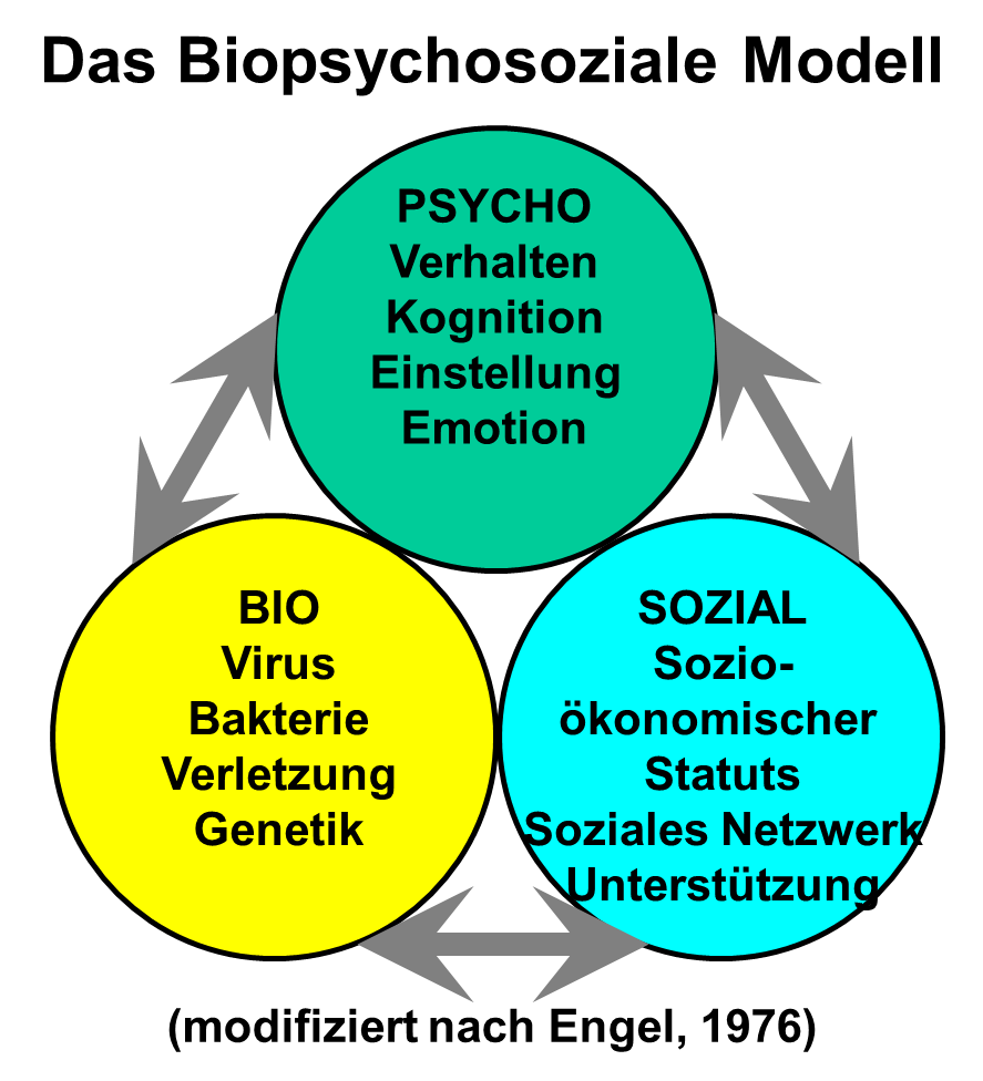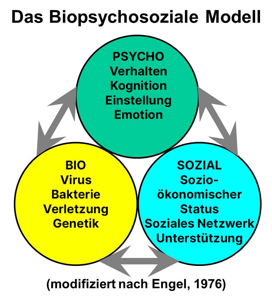 In unserer Arbeit stützen wir uns auf das biopsychosoziale Modell nach Engel (vgl. Grafik). Dieses besagt, dass verschiedene Faktoren an der Förderung von Gesundheit und der Verhinderung von Krankheit beteiligt sind.