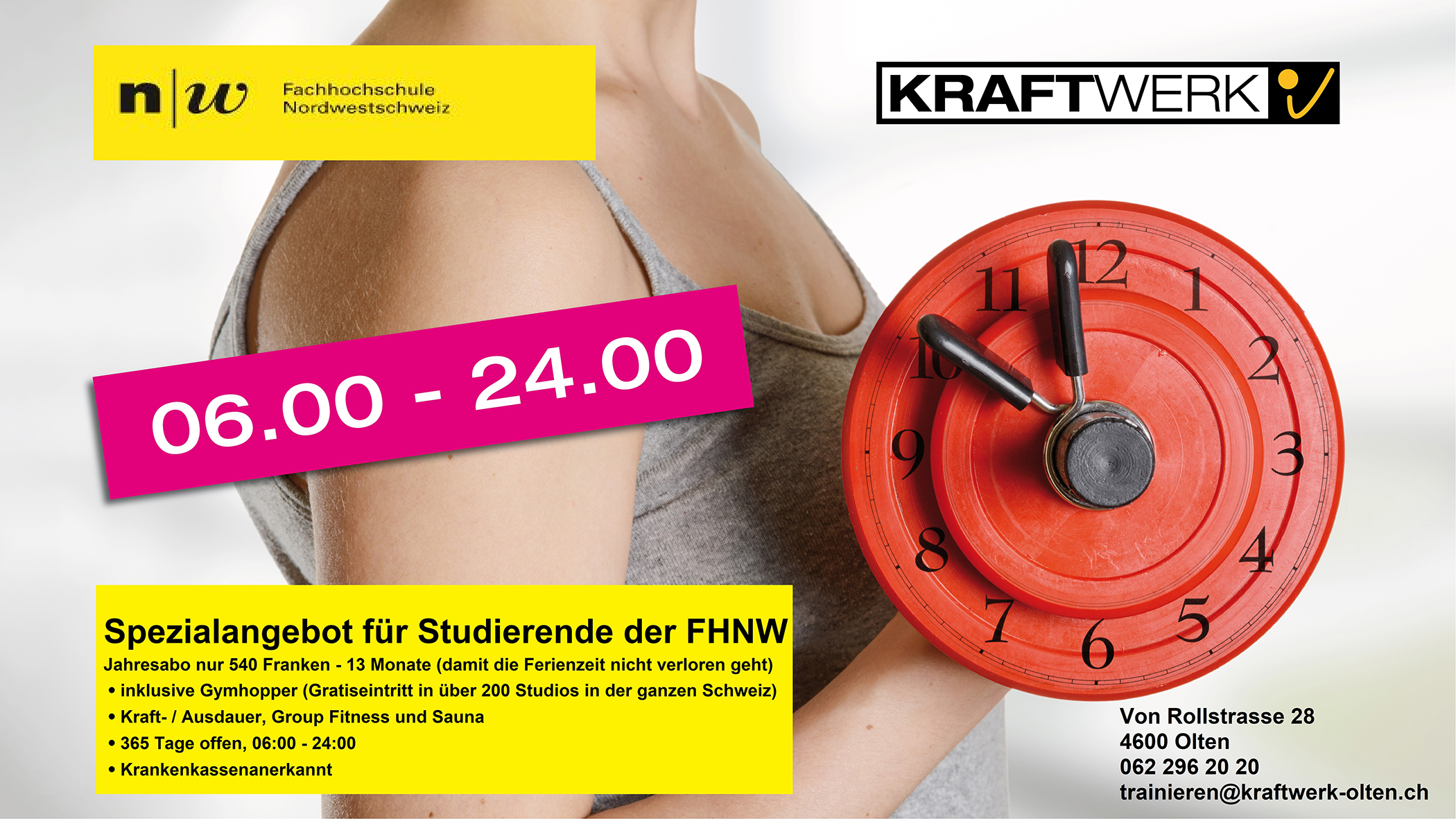 Anbieter: SportGYM Aarburg Angebot: Spezialpreis für FHNW Studierende und Mitarbeitende (als Gutschein). Weitere Infos SportGym Aarburg. Website: www.sportgym.ch |