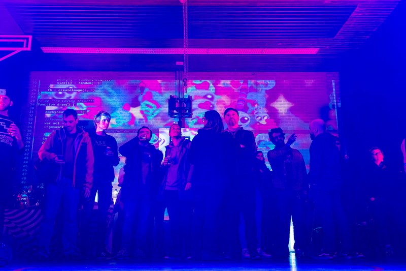 Das Setting erlaubte es dem Publikum, jederzeit aktiv in die P5LIVE-Cocoding-Präsentation einzugreifen. Die gemeinsame Codebasis fing bei Null an, wurde erweitert, gebrochen, verändert, komplexer und führte die Performance-Teilnehmer:innen in neue, unerwartete visuelle Gefilde.
