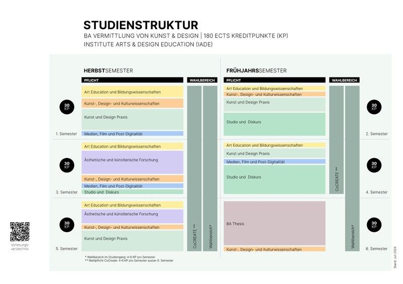 Das Studium beinhaltet Pflicht-, Wahlpflicht- und Wahlmodule, die die Kompetenzbereiche in Arts and Design Education aufnehmen und in der abschliessenden BA Thesis bündeln.