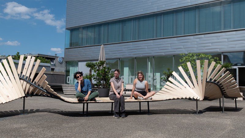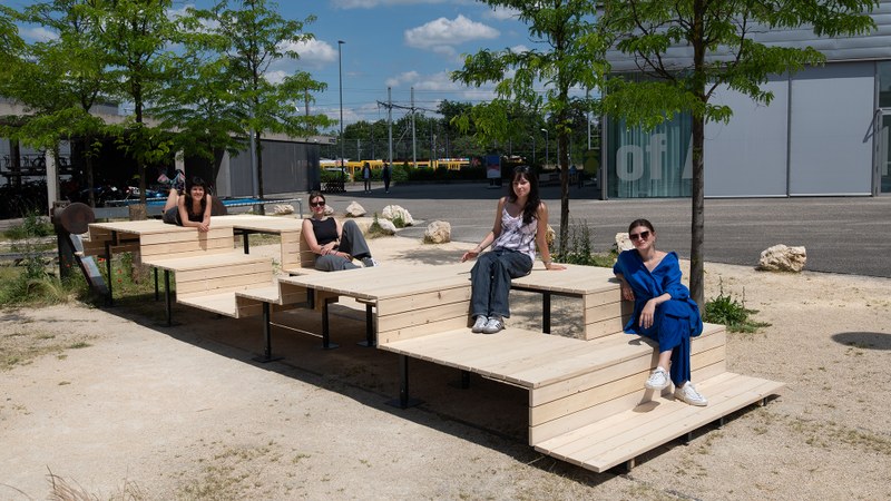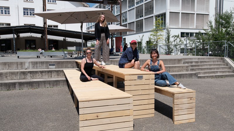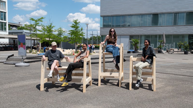 Im öffentlichen Bereich des Campusgeländes wurden im Laufe des Semesters sieben neue Orte für Studierende und Mitarbeitende konzipiert, entworfen, geplant und selbstständig in Teams auf dem Freilagerplatz in Basel realisiert.
