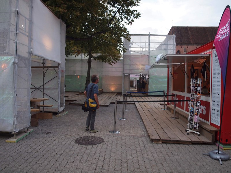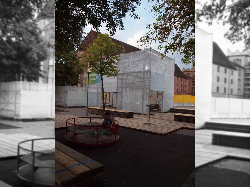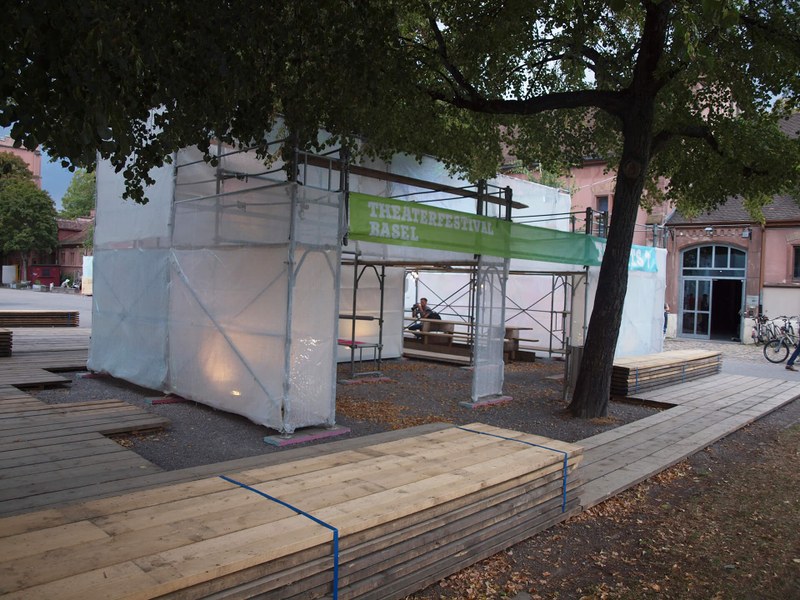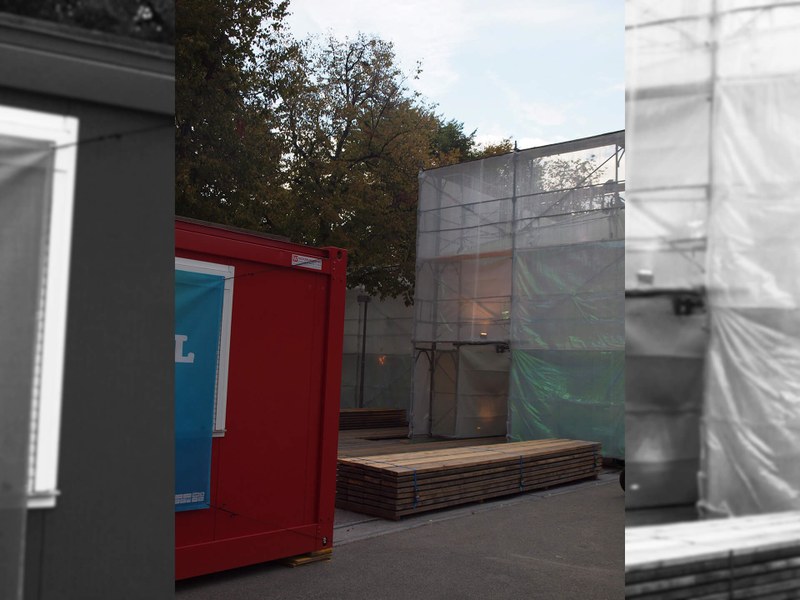 Das Theater kann verzaubern oder erschüttern, kann einen an die Hand nehmen oder ohne Vorankündigung zu Ende sein. Hinter den geschlossenen Türen erlebt jede_r Besucher_in seine eigene Geschichte, erfährt andere Emotionen und lässt sich in andere Welten verführen. Im Kontrast zum Theater steht die Baustelle, im hinteren Teil des Kasernenareals. Ihr banales Erscheinungsbild steht der schillernden Theaterwelt gegenüber. Auf dem Platz des Festivalzentrums begegnen sich diese beiden Gegensätze. Hier kommen die Geschichten zusammen, werden die Erfahrungen geteilt und finden die beiden Welten zueinander.