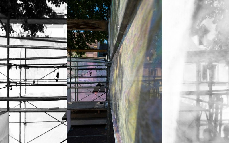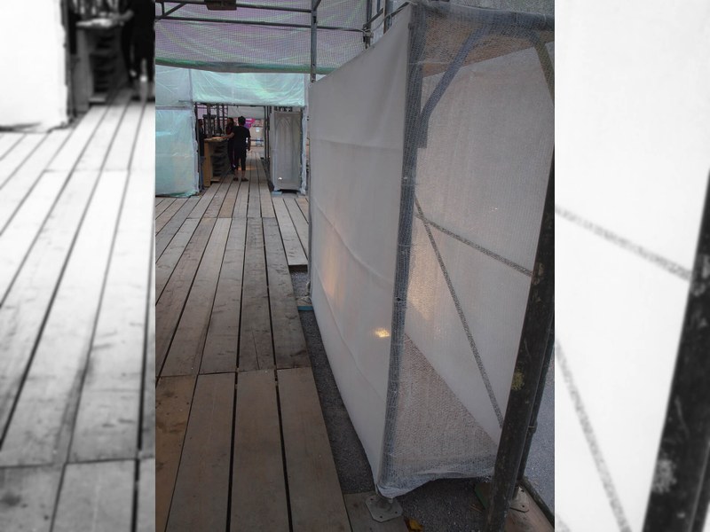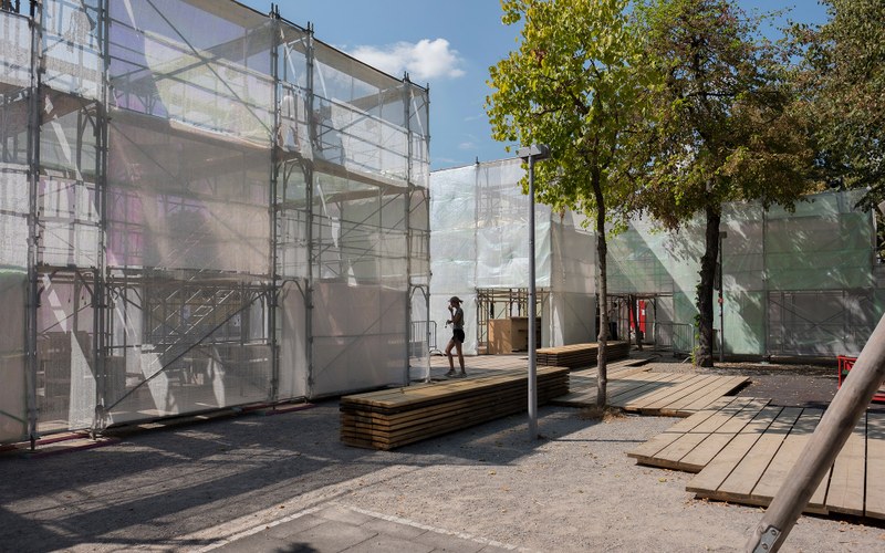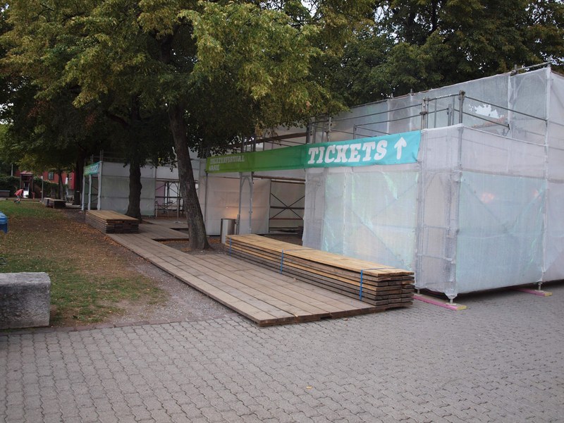 Das Areal des Festivalzentrums gliedert sich in drei schillernde Volumina - Konstruktionen aus Fassadengerüsten und Bohlen. Jeweils umhüllt von einem Netz, welches im Winde spielend, den Skulpturen etwas Lebendiges verleiht. Eine partiell eingesetzte, in allen Farben schimmernde Folie kontrastiert die starre Konstruktion des Gerüsts. Damit hebt sich das Gebilde von der dahinterliegenden Baustelle ab. Holzbohlen verbinden die einzelnen Gefüge miteinander. Sie leiten den Besucher durch das Areal und bilden um die Pavillons Aufenthaltszonen mit Sitzgelegenheiten.