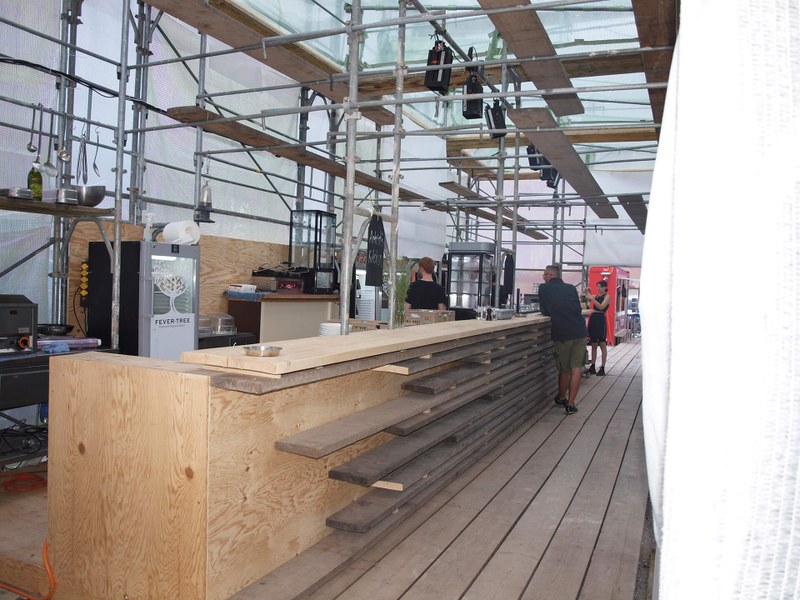 Das Festivalzentrum vereint den imaginären, träumenden Schein des Theaters mit dem klaren, banalen Sein der Baustelle. Schein und Sein, beide Welten prallen hier aufeinander, werden ineinander integriert und lösen sich auf.