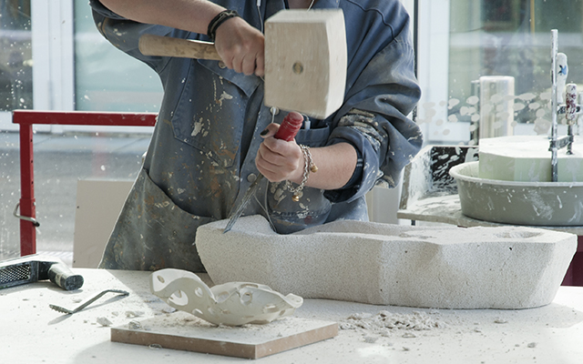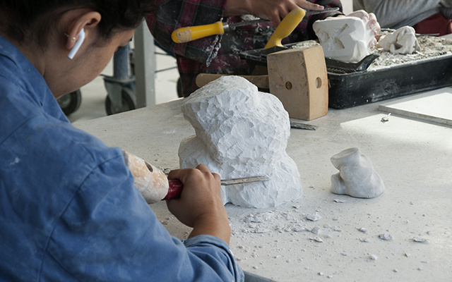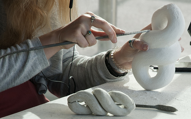 Die Studierenden arbeiten zum Beispiel an Skulpturen, Objekten & Installationen, an Modellen, an architektonischen Modellen sowie an Körperabformungen und Accessoires. In der Bildhauerwerkstatt Basiswissen wird der Umgang mit räumlichem Gestalten erprobt.