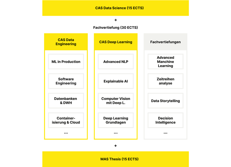 Der MAS Data Science ist modular aufgebaut und umfasst insgesamt 60 ECTS-Punkte. Die beiden Weiterbildungsprogramme «CAS Data Engineering» und «CAS Deep Learning» beinhalten verschiedene Fachvertiefungsmodule, die dem MAS Data Science angerechnet werden können.. Das CAS Deep Learning lässt sich vollständig an den MAS Data Science anrechnen. Zudem kannst du entweder das CAS Data Engineering oder das CAS AI Operations vollständig an den MAS Data Science angerechnet werden.