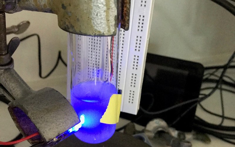 Melanie, Bachelor-Studentin in Bioanalytik und Zellbiologie an der Hochschule für Life Sciences FHNW, löst Natriumthiosulfat in Wasser und verdünnt die Lösung mit Salzsäure. Anschliessend wird die Lösung gerührt und es entsteht eine Trübung, die durch kolloidalen Schwefel verursacht wird. Die Trübung wird mit einer Photozelle auf der einen Seite des Reaktionsgefässes und einer LED auf der gegenüberliegenden Seite gemessen. Je mehr Schwefel erzeugt wird desto weniger Licht wird von der LED absorbiert. Die Photozelle «sieht» weniger Licht bis der Wert des noch durchscheinenden Lichts konstant bleibt. Dann ist die Reaktion zu Ende.