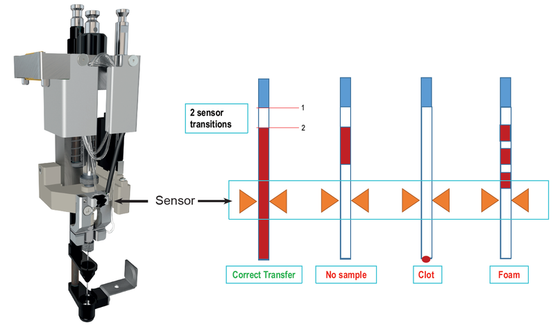 Verschiedene Adapter ermöglichen die Verwendung unterschiedlicher Primärröhrchenformate. Der optische Sensor, der sich an der Probenschleife des Tools befindet (orangefarbene Dreiecke in der Skizze oben), überwacht die Ansaugung der Probe, von Luftspalten oder Blasen. Verschiedene Probenahmesituationen (Injektion mit Luftspalten, Verstopfungen, Blasen) erzeugen unterschiedliche Sensorsignalmuster, die definierte Systemaktionen auslösen.