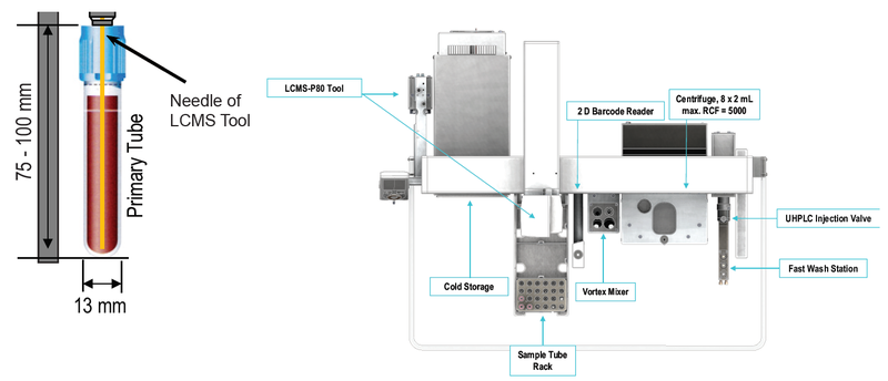 Das PAL RTC (siehe Abbildung unten) kann zusätzliche Probenvorbereitungsschritte durchführen, beispielsweise die Zugabe von Standards und Reagenzien, Zentrifugation und Flüssig-Flüssig-Extraktion (LLE). Das LCMS-P 80 Tool ist mit einer speziellen Nadel ausgestattet, die eine direkte Probenentnahme aus Primärröhrchen ermöglicht. Mithilfe spezieller Adapter können Primärröhrchen zu und von Modulen des Systems transportiert werden, beispielsweise zum Vortexen.