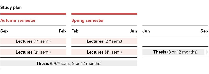Das Master-Studium kann im Frühlings- oder im Herbstsemester gestartet werden und ist als Vollzeitprogramm über drei Semester konzipiert. In den ersten beiden Semestern liegt der Fokus auf dem Besuch von Vorlesungen und der Vertiefung fachlicher Kompetenzen.