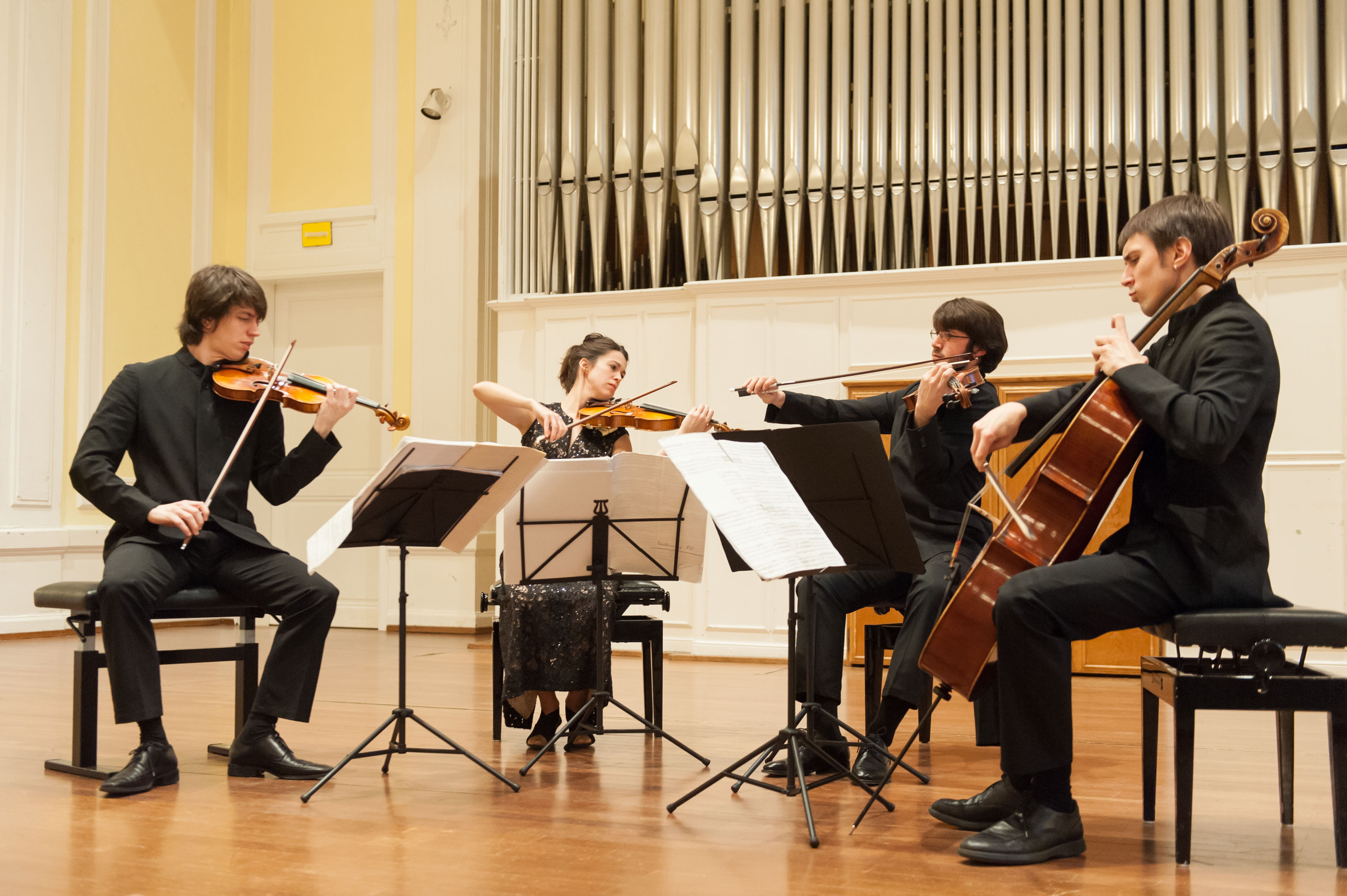 Im Rahmen der vier Konzerte vom 9./10. März im Grossen Saal der Musik-Akademie Basel werden fünf Streichquartette auftreten. Das musikalische Spektrum reicht von der Wiener Klassik bis zu John Cage. Auf dem Programm stehen Werke von J. Haydn, W.A. Mozart und L. v. Beethoven. Das 19. Jahrhundert ist vertreten durch Mendelssohns f-Moll-Quartett und Brahms drittes Streichquartett von 1875. Aus dem 20. Jahrhundert werden Ravels Streichquartett und Brittens Three Divertimenti zu hören sein, ebenso György Kurtágs drittes Streichquartett Officium breve, John Cages FOUR aus seinem späten Zyklus Number Pieces, ein Satz aus Thomas Adès' Arcadiana sowie vom Basler Komponisten Jacques Wildberger das Werk Commiato.
