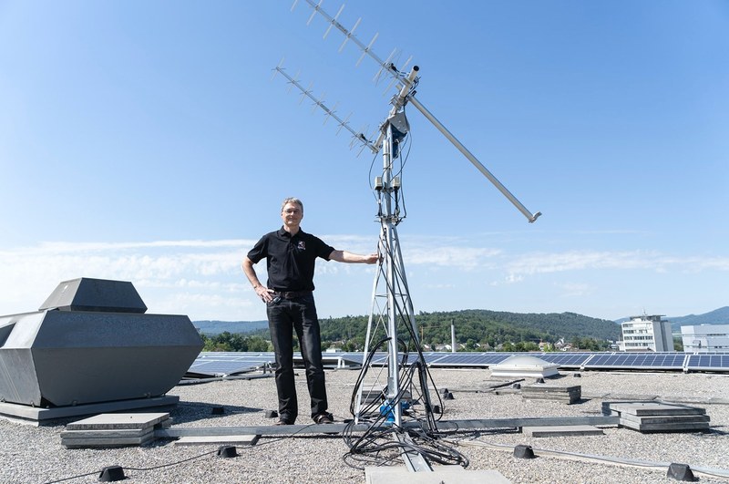 Professor Christoph Wildfeuer kommuniziert via Antenne auf dem FHNW Campus Brugg-Windisch mit dem Nanosatelliten «SpooQy-1». (Foto: Sandro Nydegger/FHNW)