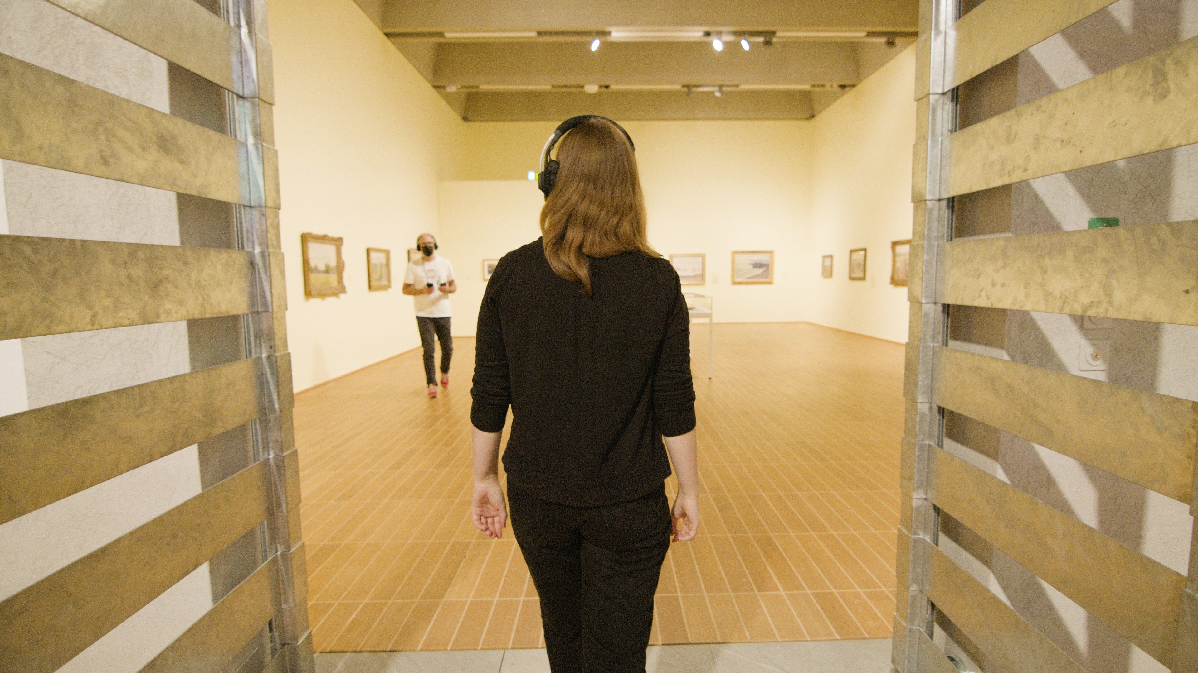 Die Grundlage für Pissarro Sounds bildet ein interaktives 3D-Modell, in dem eine exakte Kopie der Ausstellungsräume hinterlegt ist. Vergleichbar mit einem Computergame, das aus virtuellen Räumen und Objekten besteht, sind auch in diesem digitalen Zwilling der Ausstellung Camille Pissarro verschiedene Objekte, Sounds, Interaktionen und Triggerzonen verortet. Das ist der Kern der von iart speziell für Anwendungen im Museum entwickelten Mixed Reality Plattform (MxRP). Ein hochpräzises Location Tracking erfasst die Bewegung der Besucher:innen in Echtzeit und überträgt ihre Position ins 3D-Modell. Das Tracking baut auf Ultra-Breitband-Technologie (UWB) auf. Es erfolgt über spezielle Kopfhörer, die sich von der Optik und Handhabung her kaum von herkömmlichen Kopfhörern unterscheiden. Jeder Kopfhörer empfängt die Signale von im Ausstellungsraum verteilten UWB-Sendern und kann basierend darauf seine eigene Position bestimmen. Ein IMU-Sensor (Inertial Measurement Unit) ermittelt zudem die Kopforientierung der Besucher:innen. So weiss das System nicht nur, wo sich die Nutzer:innen befinden, sondern auch, in welche Richtung sie schauen. All diese Informationen werden in Echtzeit verarbeitet. In der sogenannten Binaural- Synthese werden sowohl die Eigenschaften des menschlichen Ohres als auch akustische Raumeigenschaften miteinbezogen. So entstehen die Klangräume im Moment, in dem die Besucher:innen sich durch die Ausstellung bewegen.