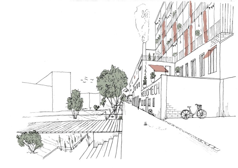 Das Konzept sieht zudem vielfältige grüne Bereiche vor, etwa auf Dächern. Der Quartiersplatz mit Bistro wird zum Herzstück und Anziehungspunkt das neuen Gelatine-Quartiers. Ein Wegnetz schafft neue Verbindungen zu den umliegenden Quartieren.