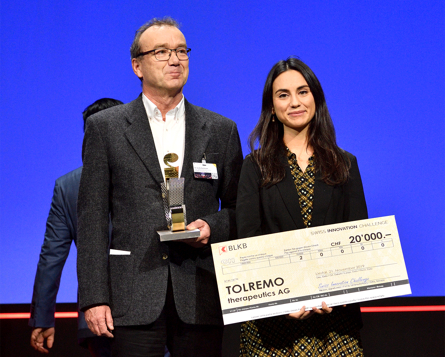 Am Tag der Wirtschaft am 21. November 2019 wurde die diesjährige Siegerin der Swiss Innovation Challenge gekürt. Gewonnen hat die TOLREMO therapeutics AG. Ein Unternehmen, das sich mit niedermolekularen Wirkstoffen im Kampf gegen den Krebs engagiert.