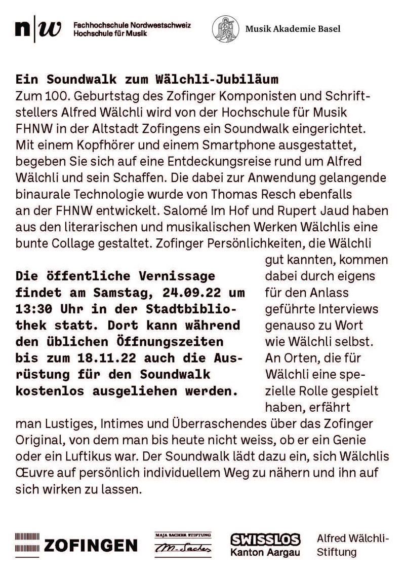 2022 jährt sich der Geburtstag des Komponisten und Schriftstellers Alfred Wälchli zum 100. Mal. Diesen Umstand nimmt das Forschungsteam in Zusammenarbeit mit der Alfred Wälchli-Stiftung und der Stadt Zofingen zum Anlass, einen Sound Walk zu kreieren, der das Leben und Werk Wälchlis beleuchtet. Der Walk läuft bis im Oktober. Die Ausrüstung kann in der Stadtbibliothek Zofingen ausgeliehen werden. Mit Salomé Im Hof und Rupert Jaud.