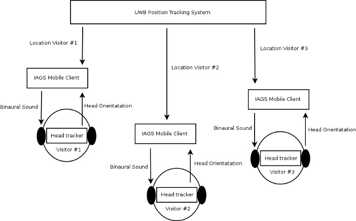 Standort und Kopforientierung werden an den IAGS Mobile Client gesendet, eine Smartphone-App, die für die ortsabhängige Audiowiedergabe und das 3D-Audio-Rendering zuständig ist. Je nach Standort und Kopforientierung des Besuchers stellt der IAGS Mobile Client Sprache, Musik und/oder Sounddesign entsprechend zur Verfügung.