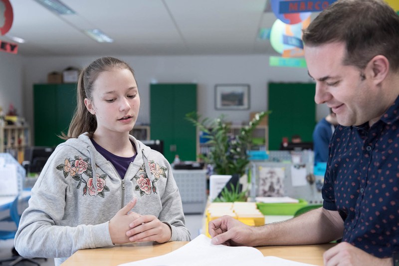 Selbst gesteuertes Lernen schliesst eine enge Begleitung der Lehrperson nicht aus: Matthias Hehlen mit einer Schülerin. Foto: Daniel Desborough