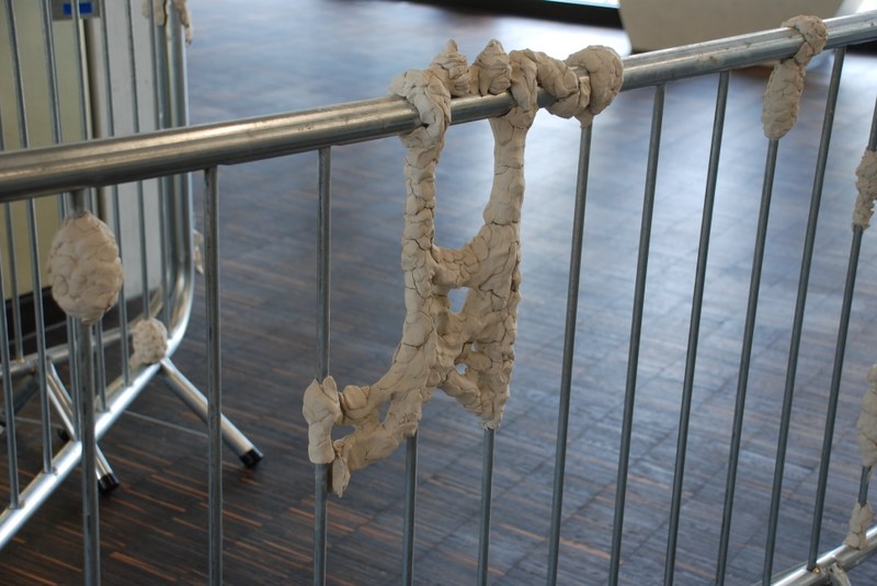 Die Arbeit nimmt die gegensätzlichen Wahrnehmungen vor Ort auf und thematisiert das Aufeinandertreffen von standardisierenden Strukturen und individuellem Ausdruck. Organisches, Sinnbild auch für Wachsendes und in seinem Eigensinn Geformtes bleibt sozusagen im Rechen der strengen Struktur hängen. Übertragen auf das Geschehen in der Bildungsinstitution werden Fragen aufgeworfen: Was bildet den inneren Zusammenhalt einer Gruppe, welche Strukturen beeinflussen das Auseinanderstreben? Die Skulptur stellt letztlich Fragen auch hinsichtlich einer formalen oder inhaltlichen Partizipation innerhalb vorgegebener Strukturen. Unter der Anweisung von Agatha Zobrist haben die Studierenden formgebend auf die Struktur eingewirkt: Der Grundstruktur haften nun individuell ausgeprägte Elemente an. Stützen die Elemente das Gerüst, überwuchern oder durchdringen sie es?
