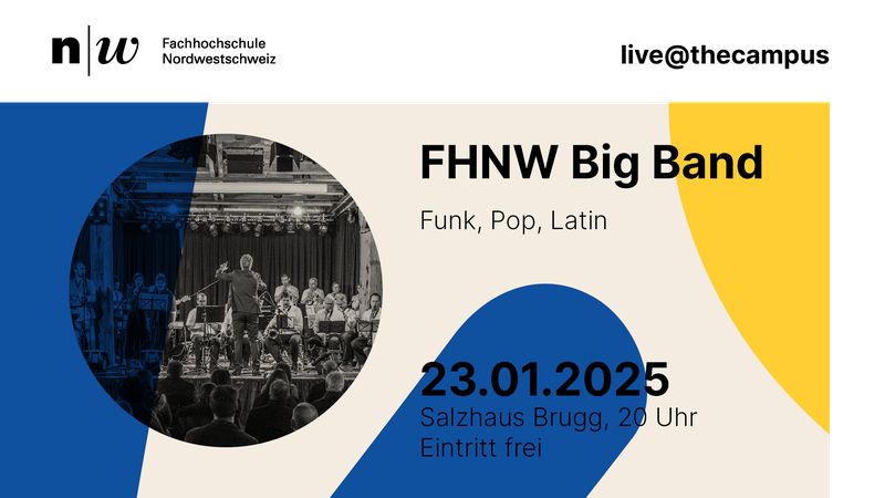 Winter-Blues, trübe Nebelstimmung, frostige Temperaturen – alles weit weg, wenn die FHNW Big Band loslässt. Mit ihrem energetischen Big Band Sound wärmt die Grossformation der FHNW die Herzen. Grosse Stimmen, brillante Solisten und mächtiger Big Band Sound aus dem Umfeld der FHNW Brugg-Windisch erwartet Sie beim Konzert zum Semesterende im Salzhaus Brugg. Die Band vereint unter der Leitung von Rafael Baier aktuelle Studierende, Alumni und Dozierende zu einem einzigartigen Klangkörper.