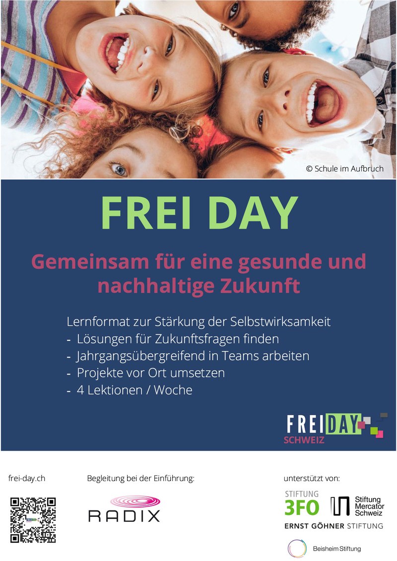 Für das Schuljahr 2026/2027 suchen wir eine Schule oder ein Stufen-/Zyklusteam, welche FREI DAY an ihrer Schule implementieren möchten.
