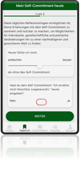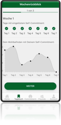 Die Tagebuchfunktion der App ermöglicht den App-Nutzer*innen festzuhalten, ob und wie ihnen ihr Self-Commitment gelingt und wie sich ihr Wohlbefinden in dieser Zeit verändert.