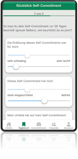 Zudem werden die Nutzer*innen am Schluss aufgefordert, ihre zu Beginn aufgestellten Hypothesen darüber, wie es ihnen mit dem Self-Commitment ergehen wird, mit den tatsächlichen Erfahrungen vergleichen.
