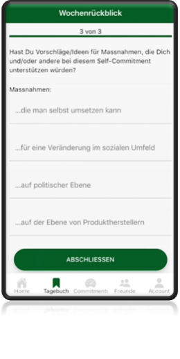 Um eine Reflexion der Erfahrungen anzuregen, generiert die BNE-App jede Woche eine Übersicht über die Einträge der vergangenen Woche und die Nutzer*innen werden eingeladen, die Posts der vergangenen Woche nochmals zu lesen und zu Faktoren zusammenzufassen, die das Self-Commitment erschweren oder erleichtern.
