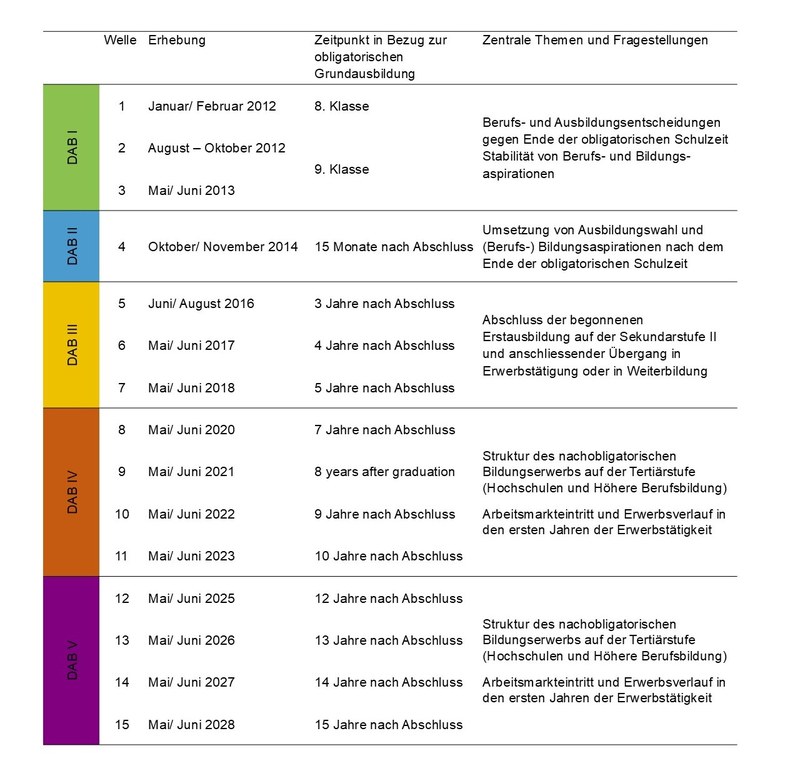 In der Weiterführung der DAB-Panelstudie (DAB II, III, IV, V) wird der Verlauf der Berufsausbildung bzw. der fortgesetzten Allgemeinbildung nach dem Übertritt in die Sekundarstufe II untersucht. Von besonderem Interesse sind einerseits Verlauf und Erfolg der Berufsausbildung, die Fortsetzung von Ausbildungen und Weiterbildung sowie der Übergang in Erwerbstätigkeit und Arbeitsmarkt. Andererseits ermöglichen die Daten der Nachbefragungen (DAB II, III, IV, V) auch Analysen in Bezug auf den Wandel und die Stabilität von Ausbildungswünschen und Berufsaspirationen sowie deren Realisierung.