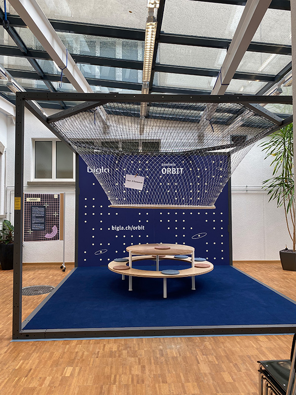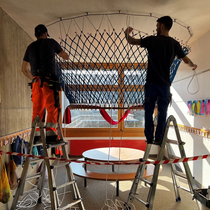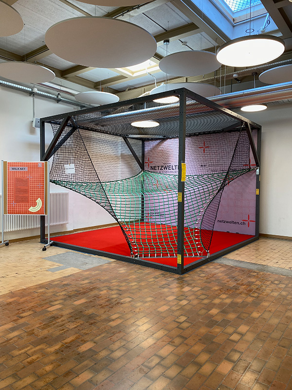 Bewegtes Lernen mit begehbaren Netzen: «Netzwelten» sind Netzflächen, die an Schulen als innovativen Lernraum genutzt werden. Eine vom Schweizerischen Nationalfonds geförderte Installation mit Ausstellung bietet die Gelegenheit, dies selbst auszuprobieren und zu erleben. Zwei Ergebnisse aus dem Innosuisse-Projekt «Netzwelten – Lernen in Bewegung» (2022–2023) werden ausgestellt: ein begehbares Netz (WalkNet® von Jakob Rope Systems) als Simulation einer Netzwelt und das Netzmöbel ORBIT® (von Bigla AG) als Gruppenraum oder als Rückzugsort.