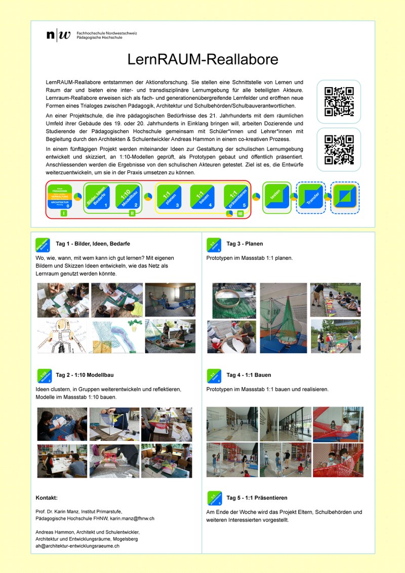 LernRAUM-Reallabore entstammen der Aktionsforschung. Sie stellen eine Schnittstelle von Lernen und Raum dar und bieten eine inter- und transdisziplinäre Lernumgebung für alle beteiligten Akteure. Lernraum-Reallabore erweisen sich als fach- und generationenübergreifende Lernfelder und eröffnen neue Formen eines Trialoges zwischen Pädagogik, Architektur und Schulbehörden/Schulbauverantwortlichen.