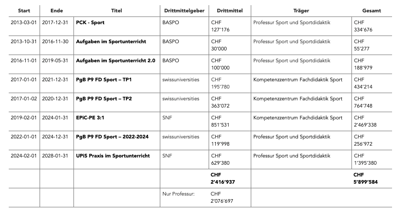 2013 | PCK-Sport (pedagogical content knowledge von Sportlehrpersonen) Drittmittelfinanziert durch den Forschungsfonds des Bundesamtes für Sport (Baspo). LINK |