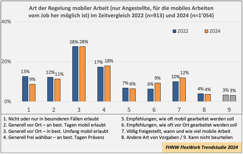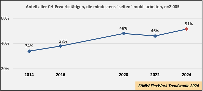Mit der FlexWork Trendstudie 2024 setzt die Hochschule für Angewandte Psychologie FHNW ihre langjährige, 2014 gestartete Untersuchungsreihe zu neuen Arbeitsformen in der Schweiz fort. Um den Veränderungen in der Arbeitswelt Rechnung zu tragen, legten die Forschenden bei der aktuellen Durchführung erstmals einen Fokus auf New Work Praktiken. Befragt wurden über 2000 Erwerbstätige in der Deutsch- und Westschweiz. Die FlexWork Trendstudie ist die einzige Langzeit-Studienreihe in der Schweiz, die sich vertieft mit mobilem Arbeiten beschäftigt.
