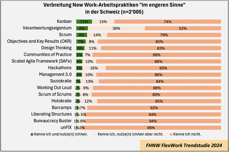 New Work bedeutet, Arbeit neu zu denken – weg von starren Arbeitszeiten, hin zu mehr Sinnhaftigkeit und Autonomie. Im weiteren Sinne umfasst New Work Ansätze zur Flexibilisierung der Arbeit. Dies ist in der Schweiz weit verbreitet: Rund drei Viertel der Erwerbstätigen profitieren von zeitlicher und/oder örtlicher Flexibilität, offenen Bürokonzepten oder Job Sharing. New Work im engeren Sinne bedeutet auch die Transformation von Entscheidungsstrukturen und Machtverhältnissen. Dies ist zwar seltener anzutreffen, aber immerhin bei einem Drittel der Erwerbstätigen werden spezifische Arbeitsmethoden und Organisationsformen genutzt, die Verantwortung neu verteilen und Innovation fördern sollen. Am häufigsten sind Kanban (11 %) und Scrum (8 %). Zusammenfassend lässt sich sagen: Einzelne Praktiken mögen Nischenphänomene sein, doch insgesamt ist New Work in der Schweiz mehr als nur eine Randerscheinung.